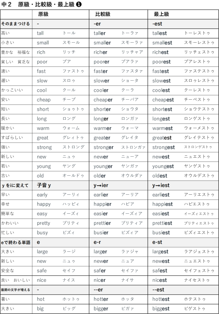 原級・比較級・最上級の表(読み方表記付き)を掲載しているのでご家庭で印刷して活用してください。