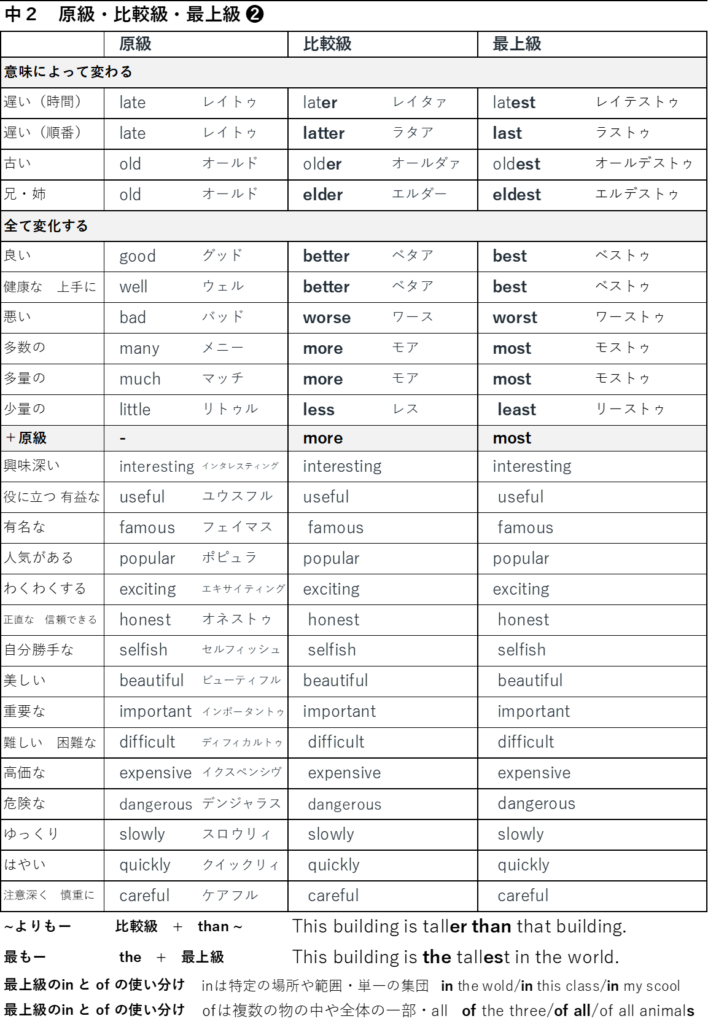 中学2年生の定期テスト用に比較級・最上級の一覧表を作成しました。